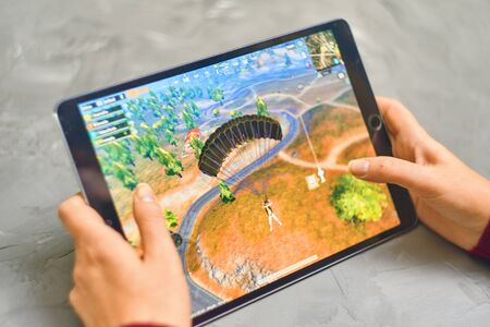Bishkek, Kyrgyzstan - January 21, 2019: Woman playing pubg coop multiplayer battle royale game on Apple ios tablet iPad Pro