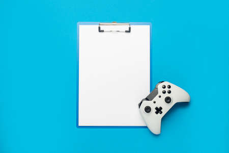 Clipboard with a blank sheet and a gamepad on a blue background. Banner. Flat lay, top view.