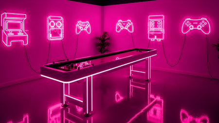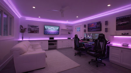 A contemporary gaming room featuring vibrant neon lights and stylish furniture, designed for comfort and functionality. Perfect for relaxation and creativity.