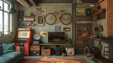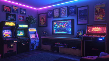 Retro game room, room for playing classic video games, 80s and 90s. Arcade machines, game consoles, nostalgic decor. Generative AI