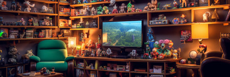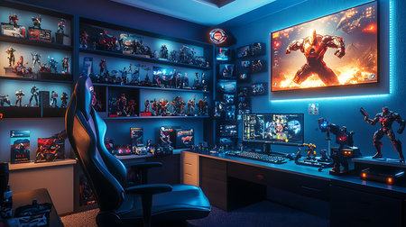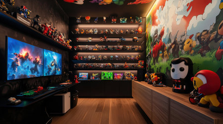 Explore a vibrant gaming room featuring collectibles and high-tech equipment.