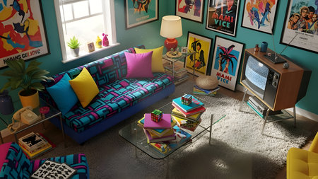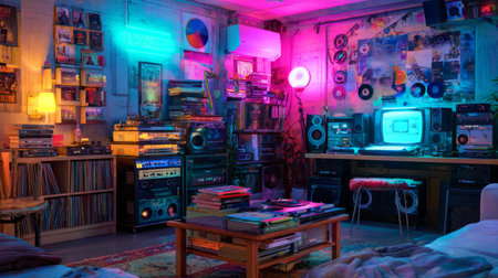Colorful nostalgic listening space with vibrant neon reflections and classic 80s music equipment