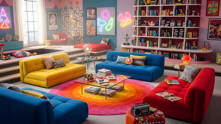 Vibrant retro living room with star-themed decor and bold orange accents. That the image is generated using AI.