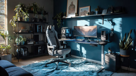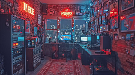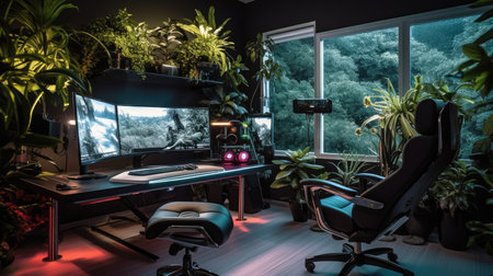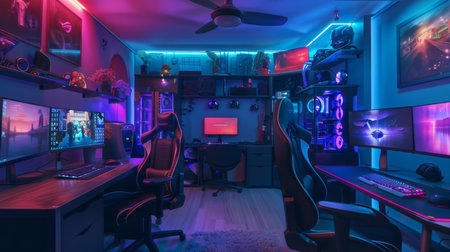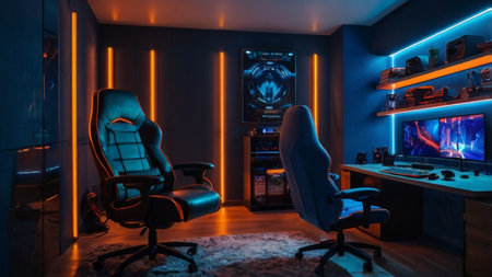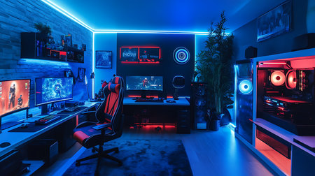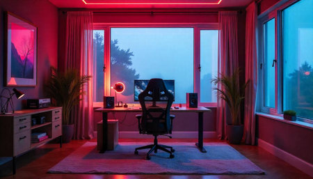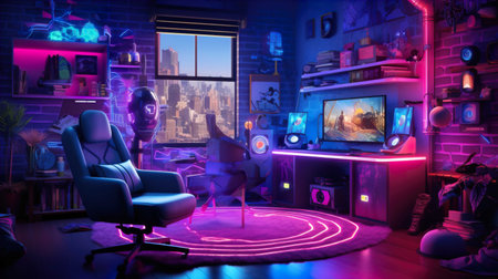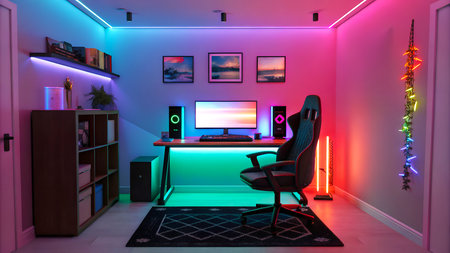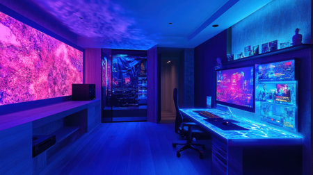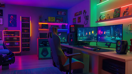 This interior showcases a gaming room equipped with a computer setup and vibrant neon lighting. The scene highlights a workstation featuring a monitor, peripherals, and a comfortable chair. The composition displays a modern design, with a focus on lighting effects and a tech-focused theme, suitable for editorial and commercial applications.