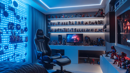 Explore a stylish gaming room filled with collectibles and ambient light for an immersive experience.