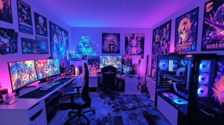 A vibrant gaming room with anime-inspired design elements, featuring colorful posters, LED lights,