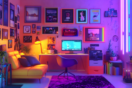 Modern creative workspace with neon lights, colorful wall art, a computer desk, cozy sofa, and vibrant decor in a stylish home office setting.