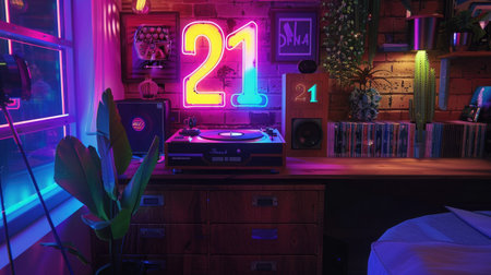 Wooden number 21 by a record player in a retro-themed room with neon lights
