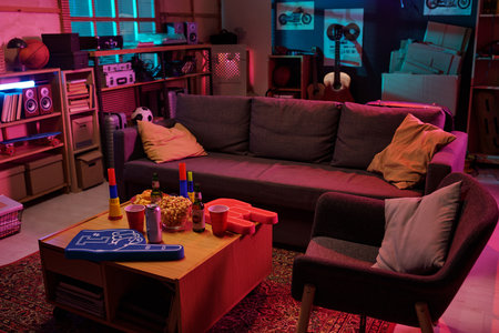 Living room scene showing empty sofa and armchair with table holding snacks, beer bottles, party cups, foam finger, party horns, illuminated by colorful lights, sports equipment in background