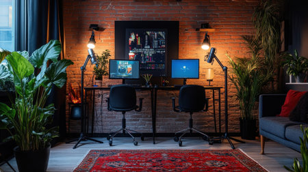 Discover a stylish and inviting home office featuring dual monitors, lush plants, cozy lighting, and a brick wall backdrop, perfect for enhancing productivity and creativity.