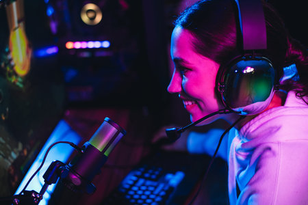 Streamer beautiful girl professional gamer smile playing online games computer with headphones, neon color