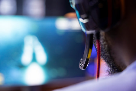 Blurred view of an African-American male gamer influencer spending time in a cyber cafe, wearing headset, and focusing on his favorite game. High quality photo
