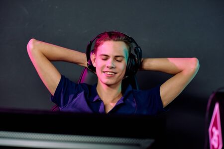 Streamer young man rejoices in victory professional gamer playing online games computer with headphones, neon color