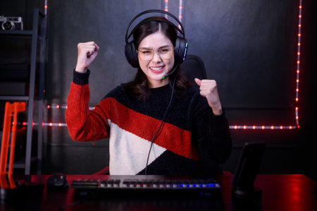 Happy young asian gamer with headset playing and winning the computer game tournament.