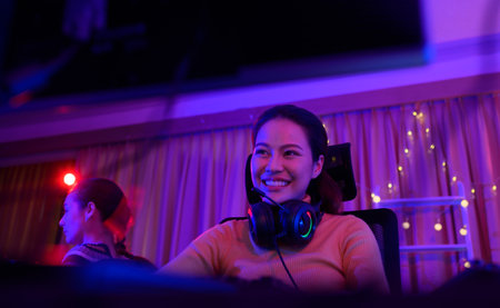 Happy Gamer endeavor plays online video games tournament with computer neon lights, young woman wearing gaming headphones intend to do playing live stream games online at home