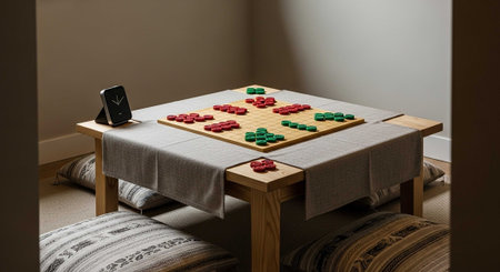 A serene game setup with a board game on a wooden table in a cozy room