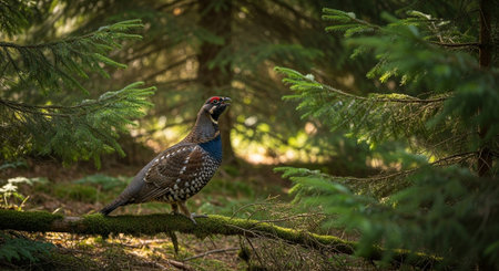 Vibrant pheasant resting in lush forest underbrush captured in impressive detail