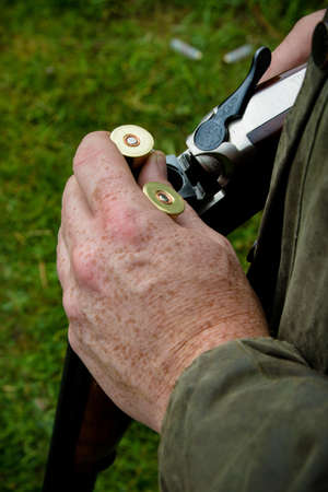 hunter loading the gun befor the hunting outdoors. side view close up photo. preparation for killing animals . cruelty