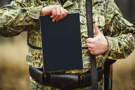 Hunting Licenses. Hunter with shotgun gun on hunt. Hunter in the fall hunting season. Man is charging a hunting rifle. Hunting gun.