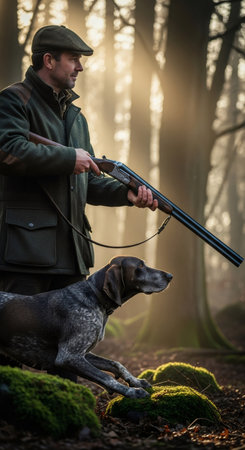 Hunter man with his hunting dog in forest wilderness. Caucasian hunter with shotgun and pointing dog on tracking wildlife. Outdoor pursuit.