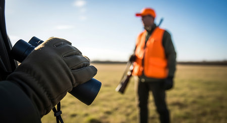 A hunter wearing gloves holds binoculars in the foreground, while another hunter in an orange safety vest and hat stands with a rifle in a field under a blue sky.