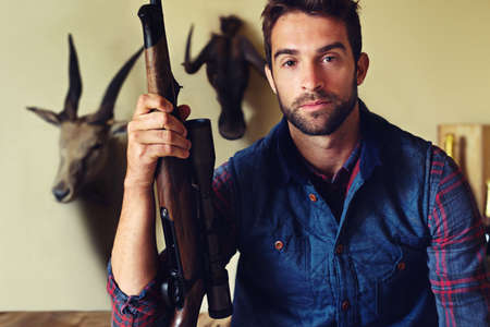 Portrait of hunting man holding his shotgun and smiling as he looks down
