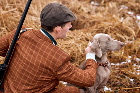 rear view on male with gray dog sitting in field waiting for target wild animal trophy, young guy in brown formal suit in nature, with shotgun. hunting, activ lifestyle, hobby concept