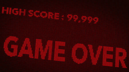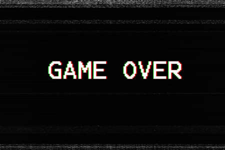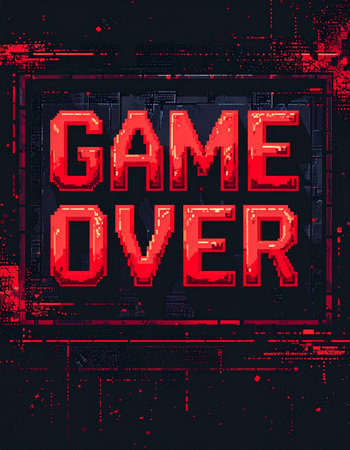 A stark red Game Over message flickers on a distorted screen, signaling the end of a digital journey. This retro-inspired graphic captures the intense moment of defeat or the conclusion of a virtual battle, with pixelated text and glitch effects creating a powerful sense of nostalgia and finality.