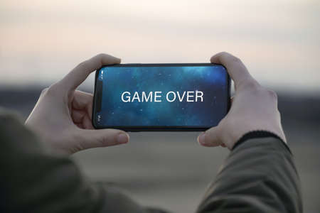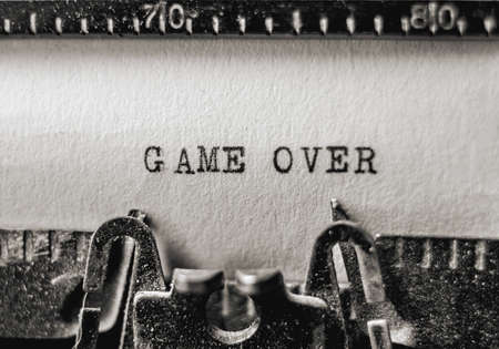 Text Game over printed on old paper sheet using black inks on retro typewriter. Closeup view