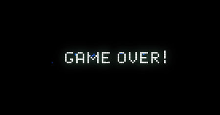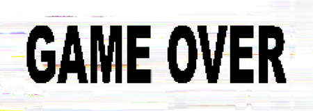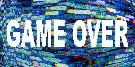 Game over message. End signal. Pixel static noise. Glitch pattern.