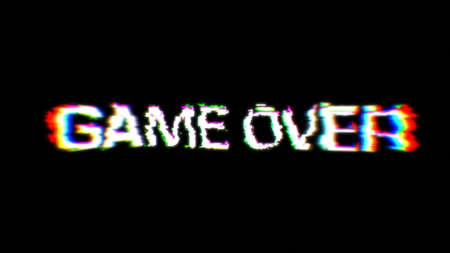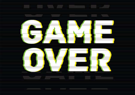 Game Over final phrase, message, inscription or lettering written with creative font on black background with damaged video effect, electronic glitch or digital noise. Modern vector illustration.