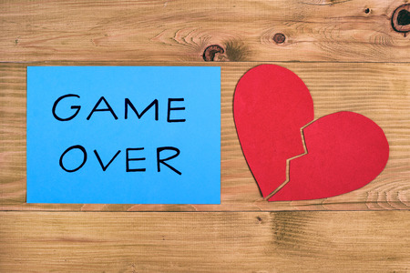 Broken heart and blue paper with text game over on wooden table.Image is intentionally toned.