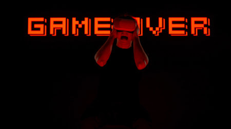 Male silhouette against black wall with neon sign. Man gamer wearing virtual reality glasses screaming standing in front of wall with neon game over text sign.