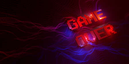 Displaying stylized GAME OVER text floating over digital backdrop, with waveforms and data streams. Futuristic, technology, digital, cybernetic, abstract, neon, data