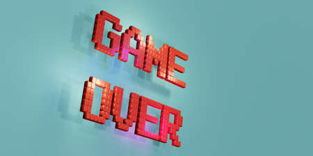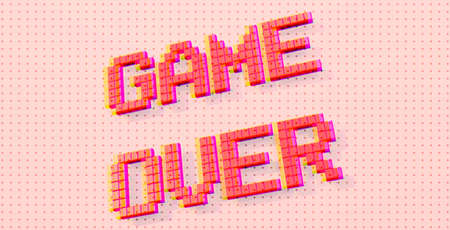 Vector game over phrase in pixel art style with glitch VHS effect. Three color half-shifted letters. Ocassional pixels and colored glitch lines around