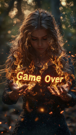 Woman surrounded by flames holding glowing text in a fantasy forest setting