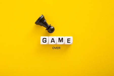 Words Game Over made from colored wooden blocks. Painted cubes with letters on yellow background. Top view. Selective focus. Copy space.