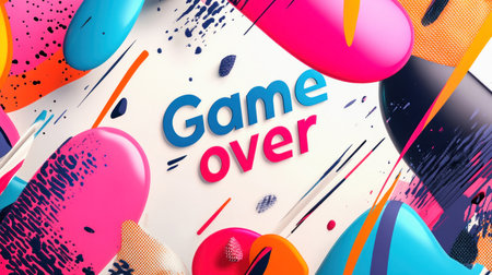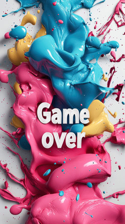 Vibrant splashes of pink, blue, and yellow paint create a dynamic visual, with game over signifying an end or conclusion