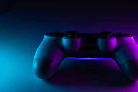 Game controller, gamepad on blue and purple neon background. macro, close up
