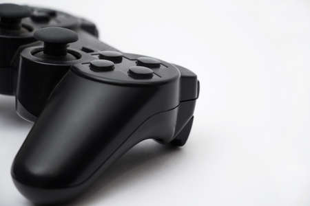 Modern black game controller side view close up isolated