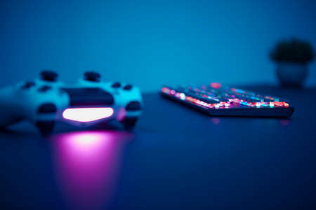 Low angle view of backlighted keyboard and game controller on table. Light blue illuminated wall in background. Professional computer game playing, esport business and online world concept.