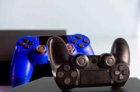 Joystick gaming controller isolated on blue background , Video game console developed Interactive Entertainment