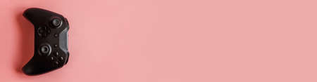 Black joystick gamepad, game console isolated on pastel pink colourful trendy pin-up background. Computer gaming competition videogame control confrontation concept. Cyberspace symbol Banner