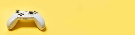 White joystick gamepad, game console isolated on yellow colourful trendy background. Computer gaming competition videogame control confrontation concept. Cyberspace symbol Banner