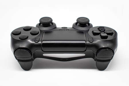 Black gaming controller, Joystick on white background, Isolated, Back angle.