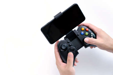 Black gaming joystick with smartphone installed into holder in gamer hands, with blank black screen, Game controller in hand, turned off, Isolated on white background