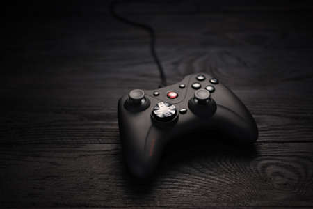 Black gamepad on a dark wooden background. Cybersport. Russia, 07/20/2020