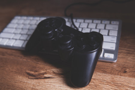 Low angle view of gaming controller and keyboard laying on table. Low light scene. Professional computer game playing, esport business and online world concept.