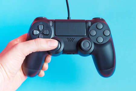 Female hand holding video game joystick on blue background close-up.