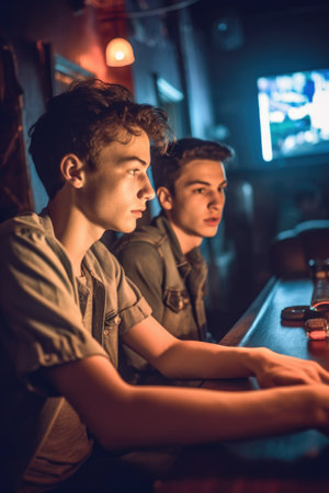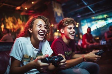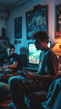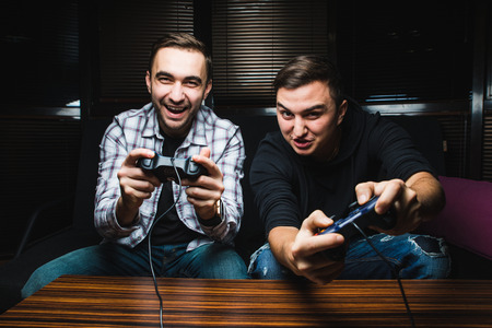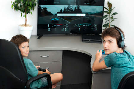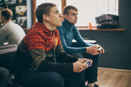 Close-up of two Caucasian teenage boys playing video games. Excited young gamers with joysticks in their hands are passionate about game and having real fun. Entertainment and gaming for kids concept.